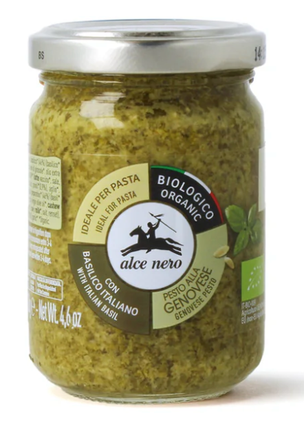 Basilikum* (46%), (basilikum* 41% af det færdige produkt, solsikkeolie*, salt), solsikkeolie*, ekstra jomfruolivenolie*, Cashewnødder*, parmiggiano reggiano-ost DOP* (2,5%) (Komælk*, salt, osteløbe*), pecorino-ost* (fåremælk*, osteløbe*, salt), salt, pinjekerner* (0,9%), hvidløg*. *Økologisk