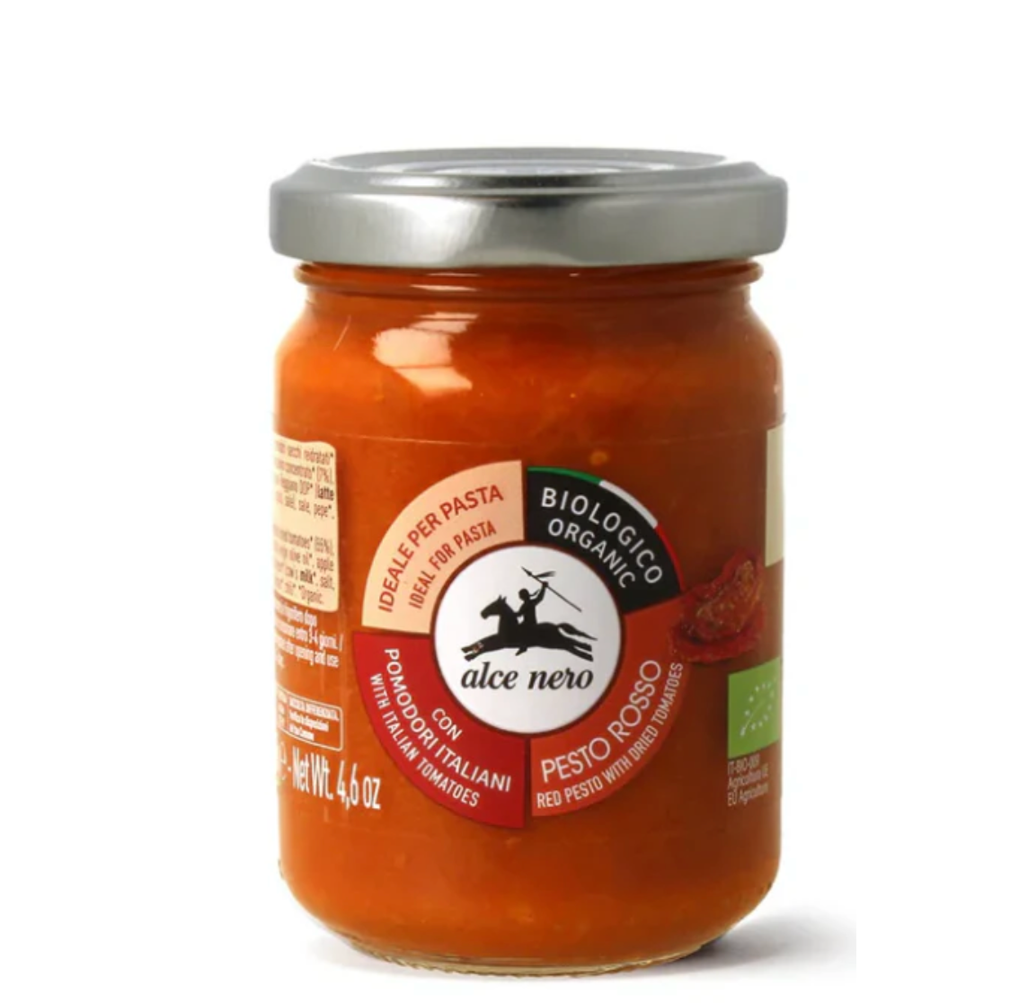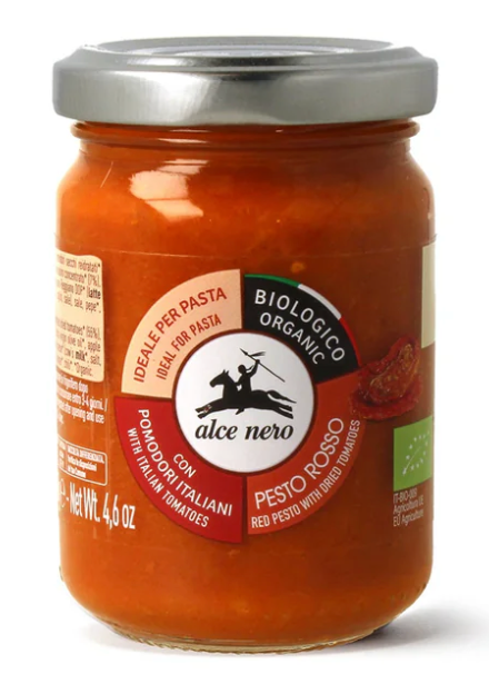 Den økologiske røde pesto fra Alce Nero er lavet med førsteklasses ingredienser, som er beriget med ekstra jomfruolivenolie.